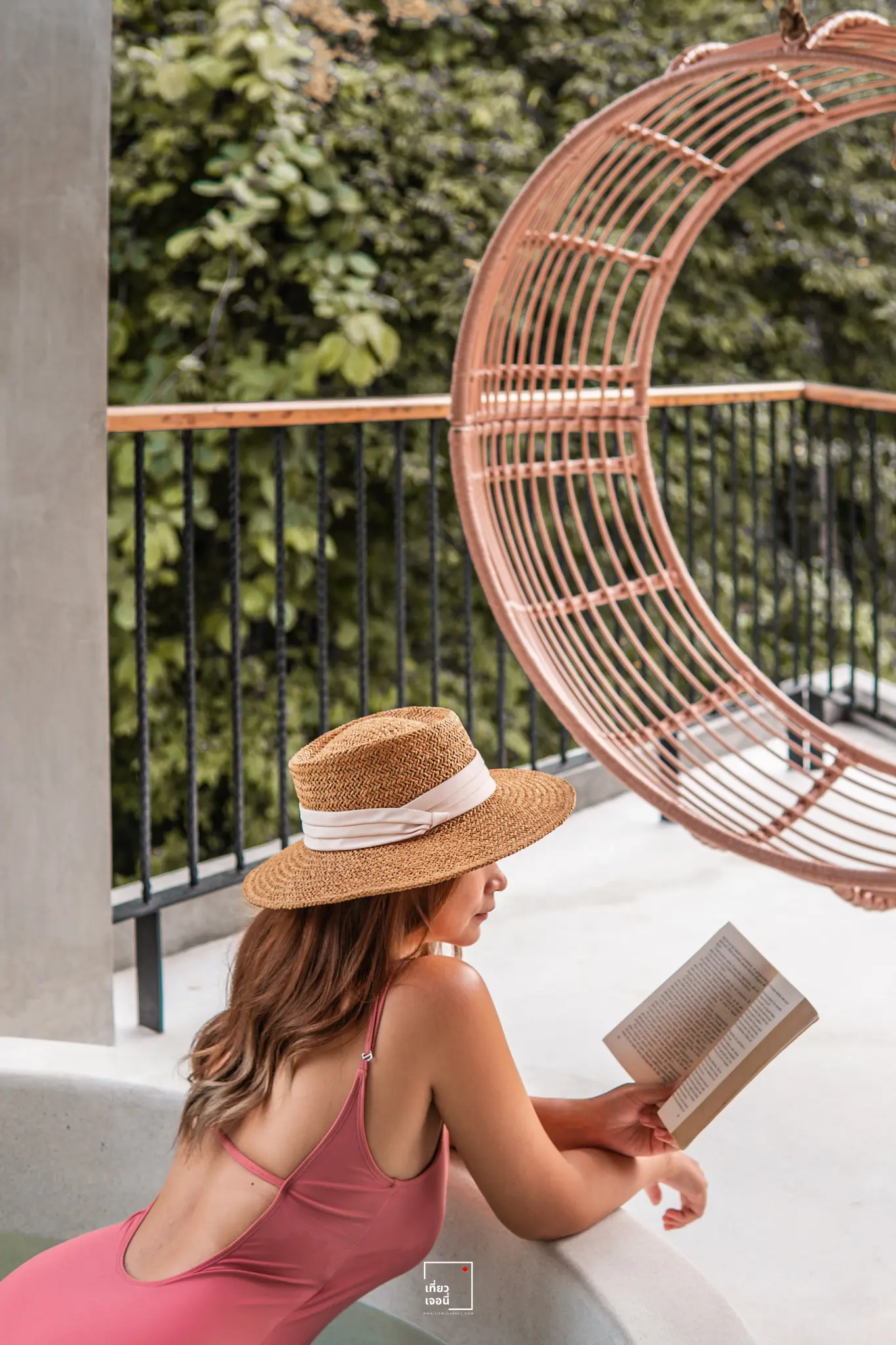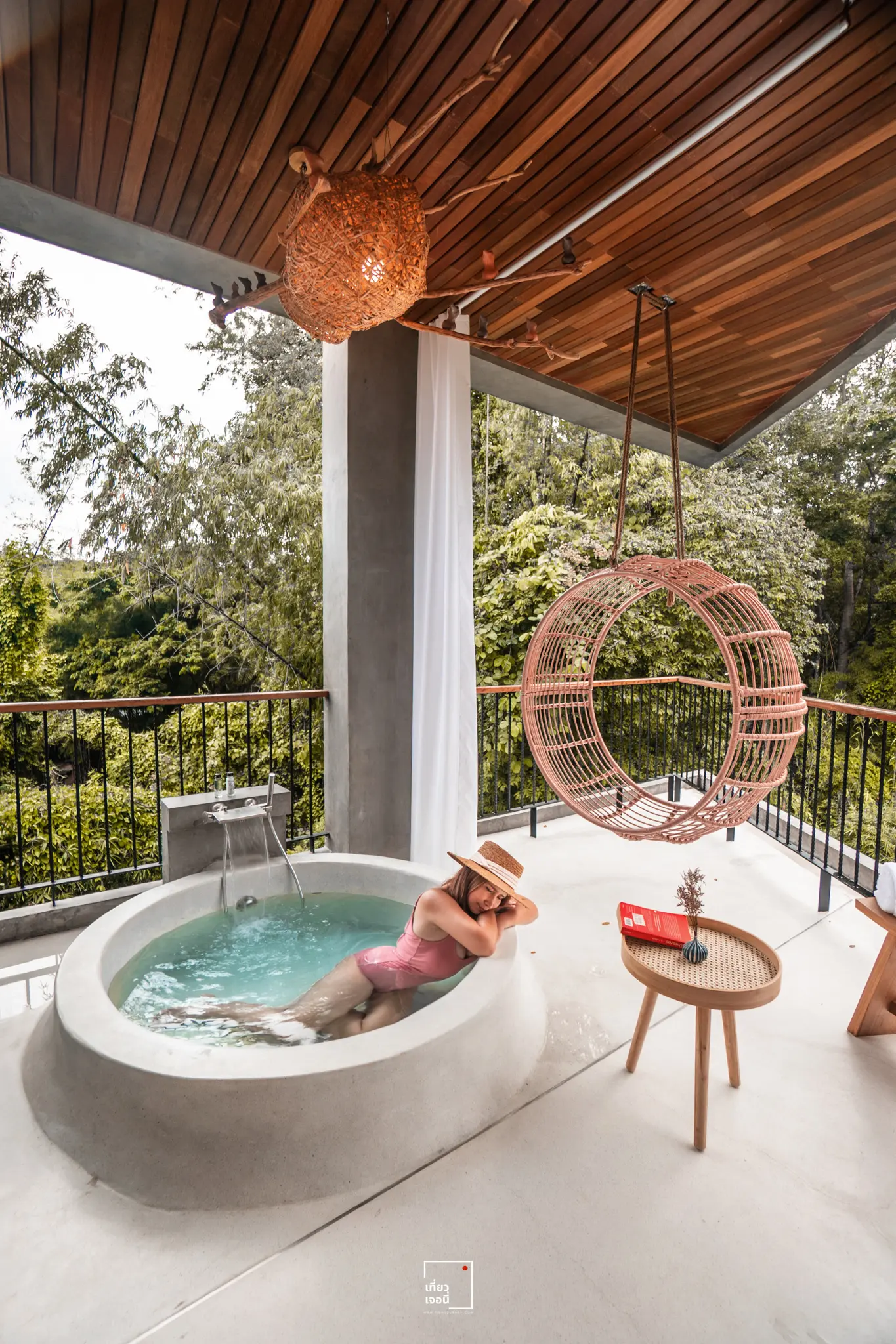 บริเวณระเบียงห้อง มีอ่างอาบน้ำแช่ตัวมีทั้งระบบน้ำอุ่นและน้ำเย็น มีเก้าอี้หวายแขวนอยู่ให้นั่งเล่นรับลม จะแช่น้ำ หรือนั่งเล่นก็ชิลดีมากๆ