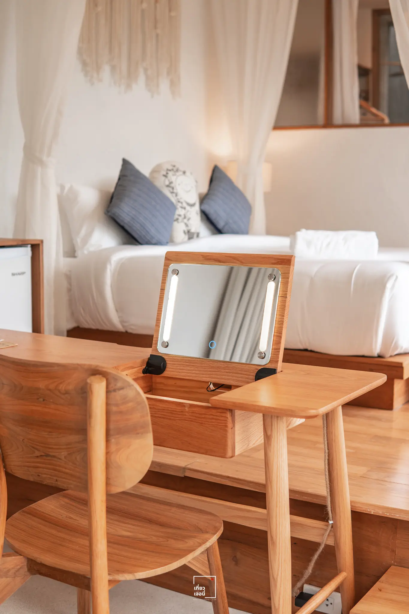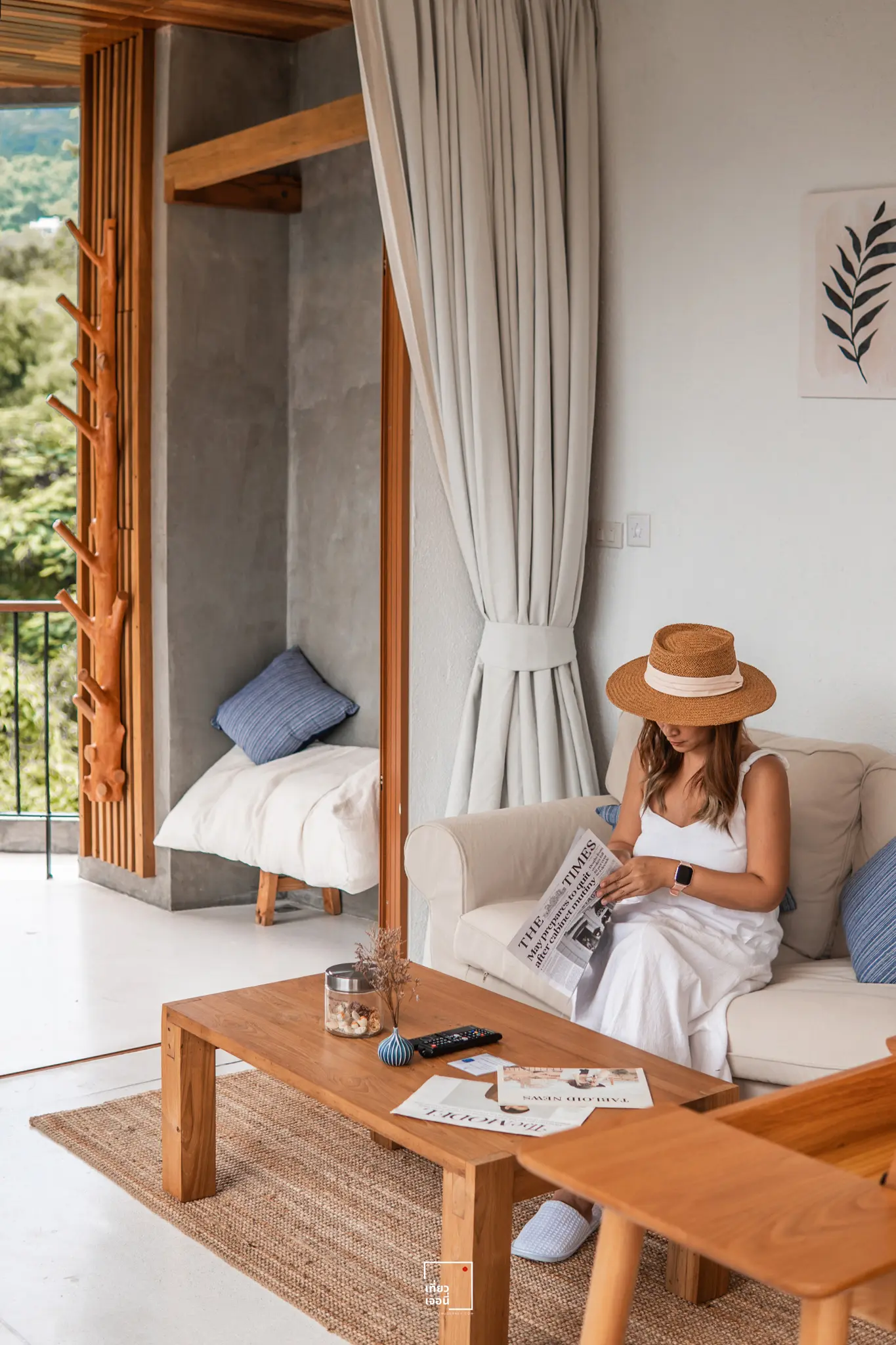 ในส่วนของเตียงนอน เลือกหันปลายเตียงออกไปทางหน้าต่างบานใหญ่ ลืมตาตื่นเช้ามาก็เจอกับวิวธรรมชาติสีเขียวๆ สบายตา เดินมายังส่วนห้องนั่งเล่น มีสเต็ปบันไดเล็กๆ ทำให้ห้องดูมีลูกเล่น และแบ่งแยกส่วนห้องนอน และส่วนนั่งเล่นแยกออกจากกัน