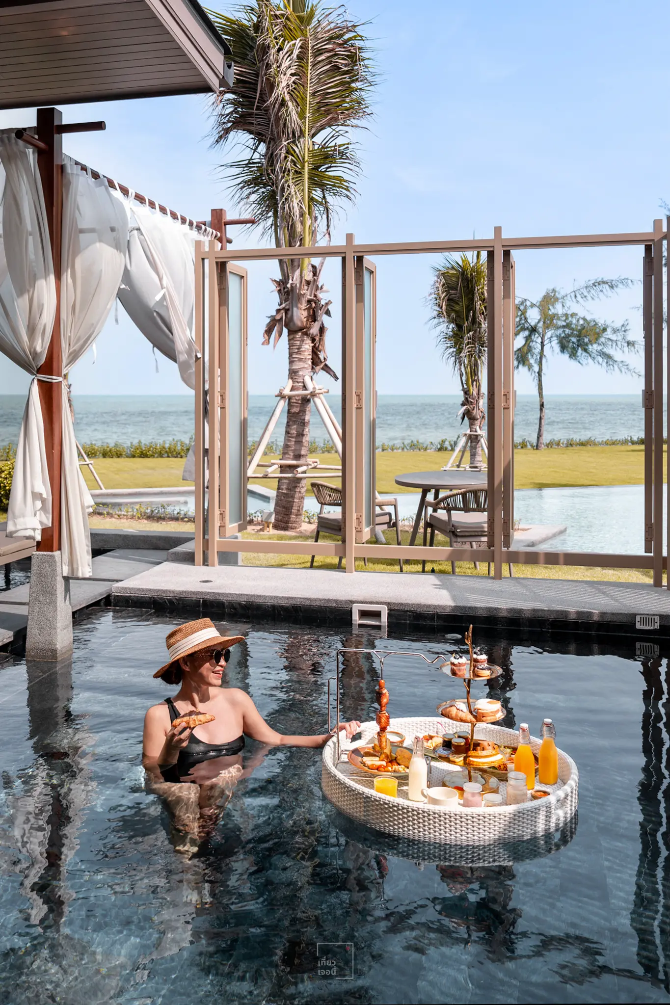 และสำหรับคนที่เข้าพักในวิลล่า ทาง รร.The Little Shore Khaolak by Katathani มีบริการอาหารเช้าแบบลอยน้ำ Floating Breakfast (อันนี้มีค่าใช้จ่ายเพิ่ม) หรือจะให้นำอาหารเช้าแบบเป็นเซตมาเสิร์ฟทานบนโต๊ะในห้องพักแทนการเดินไปทานที่ห้องอาหารก็ได้ด้วยนะ